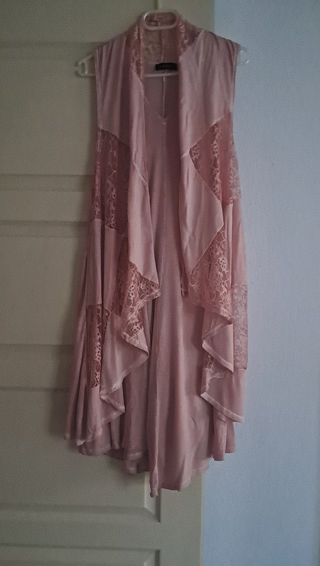 Kolsuz, uzun boy kadın elbisesi, bol kesim ve pastel pembe renkte, dantel detaylarıyla bohem tarzını yansıtıyor.