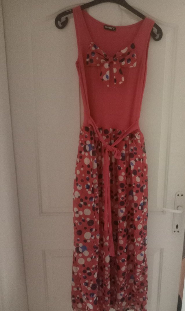 Kolsuz, pembe renkli bu elbise, boğazlı yaka ve renkli batik desenli etek kısmıyla bohem tarzını yansıtıyor. Göğüste fiyonk detayı ve drapeli tasarımı vardır.