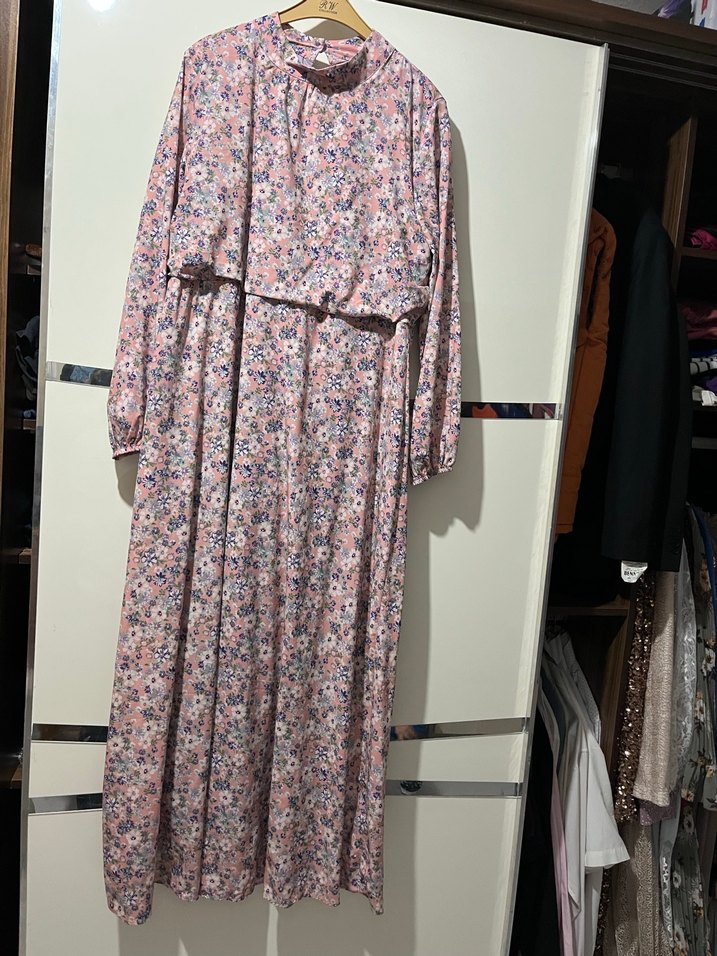 Kadınlar için uzun, salaş kesim elbise. Yüksek yakalı, uzun kollu sentetik kumaştan yapılmış, pembe pastel tie-dye desenli, bohem tarzında günlük kullanıma uygun elbise.