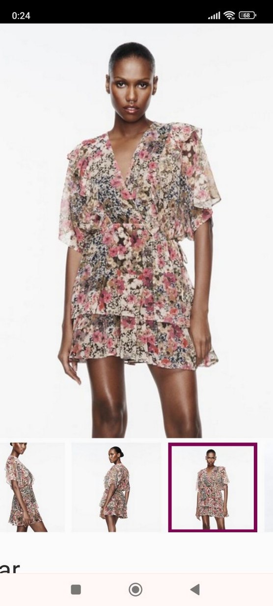Pembe bağlama desenli, V yakalı, kısa kollu ve fırfırlı, bol kesim mini elbisedir. Yumuşak sentetik kumaştan yapılmıştır, romantik akşamlar için uygundur.