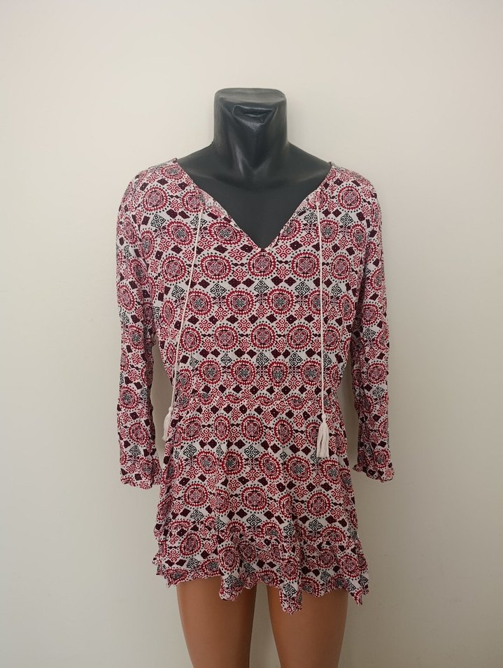 Pembe bohem V yakalı mini elbise, uzun kollu, yumuşak sentetik kumaş, dantel detaylı ve batik desenli. Bol kesim, kısa boyda rahat bir stil sunar.