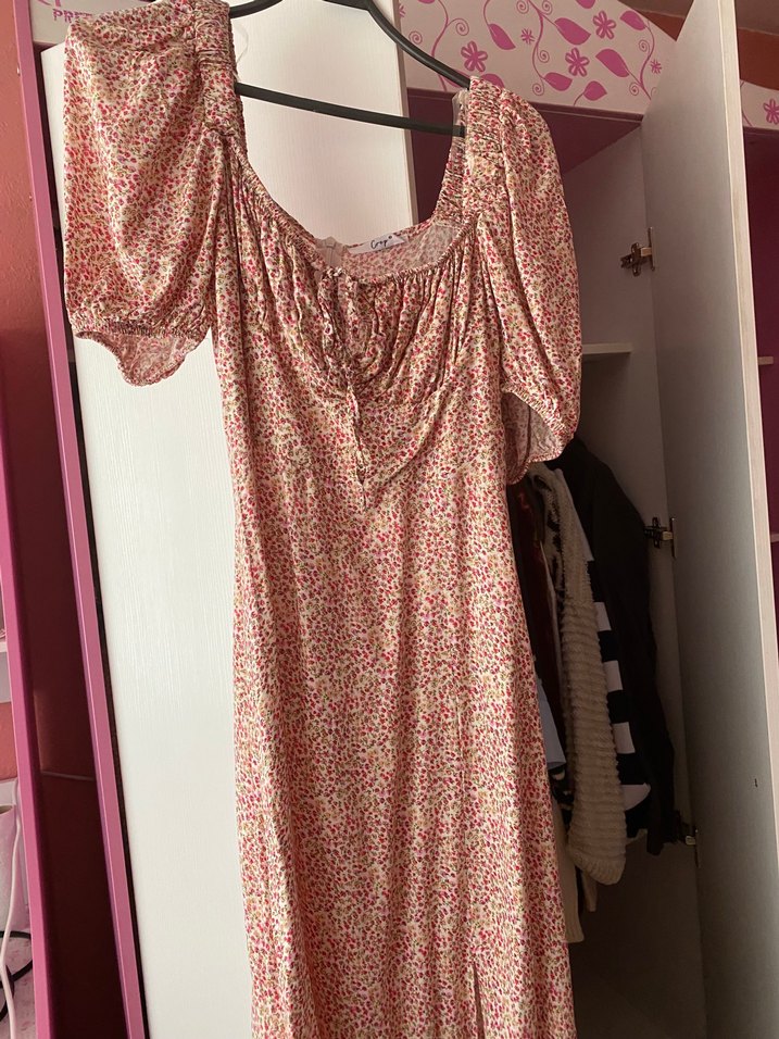 Pembe pastel tonlarda, V yakalı, kısa kollu, bol kesim ve drapeli uzun elbisedir. Yumuşak sentetik kumaştan yapılmıştır, günlük kullanım için uygundur.