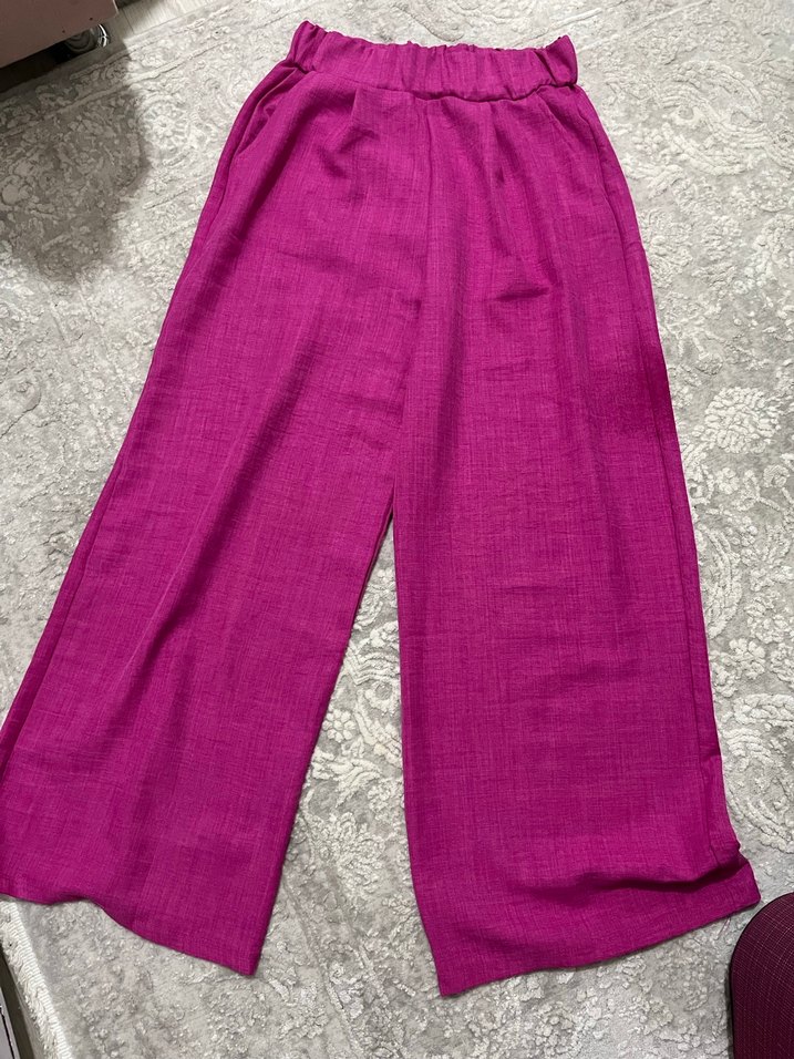 Canlı pembe renkte, bol kesim, uzun keten pantolon. Lastikli bel ve desensiz, rahat bohem tarzıyla günlük kullanıma uygun.