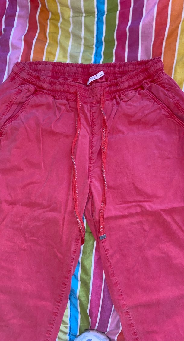 Parlak pembe keten kumaştan, bol kesim ve fermuarlı cepli midi pantolon, trend ve rahat bir stil sunar.