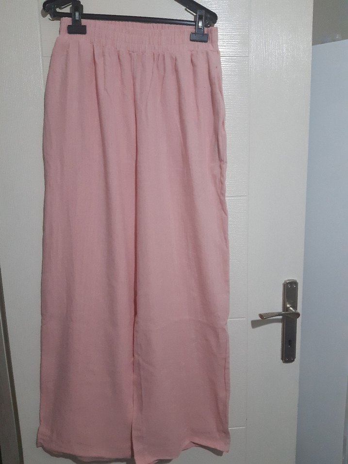 Uzun, bol kesim kadın keten pantolon, pastel pembe renkte ve piliseli detaylı. Minimalist normcore tarzıyla günlük kullanıma uygun.bedenleri mevcuttur cepli