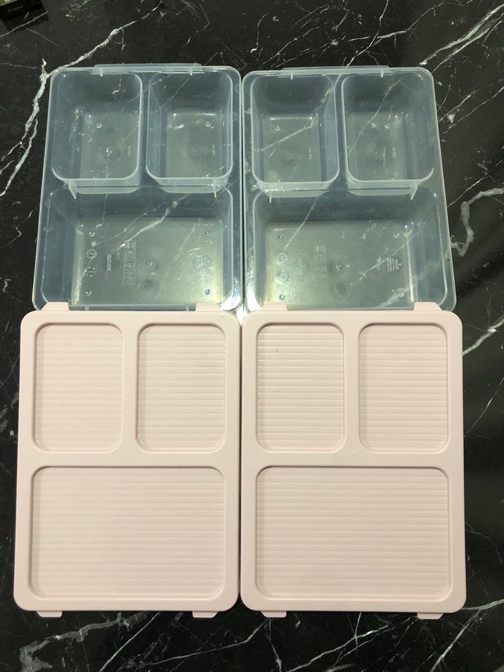 Çok bölmeli, pembe renkli yemek saklama kabı. Dayanıklı ve pratik, yemeklerinizi düzenli tutar.