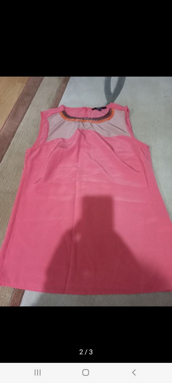 Pembe renkli, boncuklu yakalı ve drapeli detaylı kolsuz bluz. Yumuşak sentetik kumaştan, normal boyda ve vücuda oturan kesimde, günlük sokak tarzı için uygundur. hiç kullanılmadı mağazada nasılsa öyle