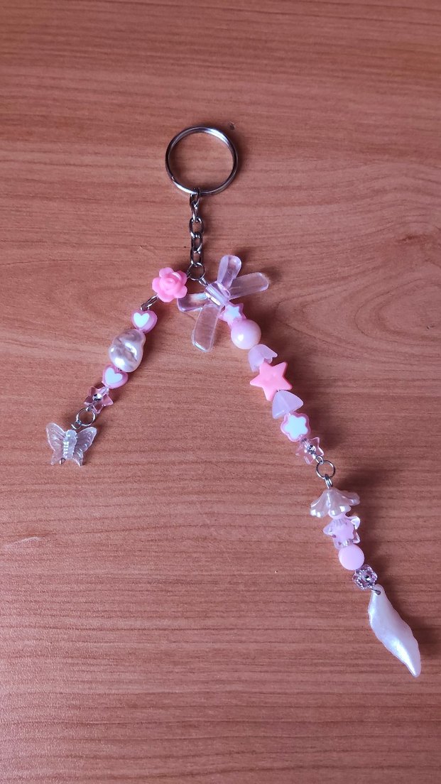 Pembe pastel tonlarında yıldız, kalp ve kelebek şeklinde boncuklarla süslenmiş, gümüş bağlantılı avant-garde tarzda anahtarlık.