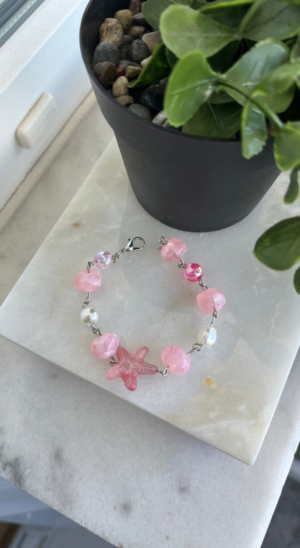 Pastel pembe boncuklar ve yıldız şekilli bir detay içeren, küçük beyaz boncuklarla süslenmiş minimalist ve bohem tarzda bileklik.