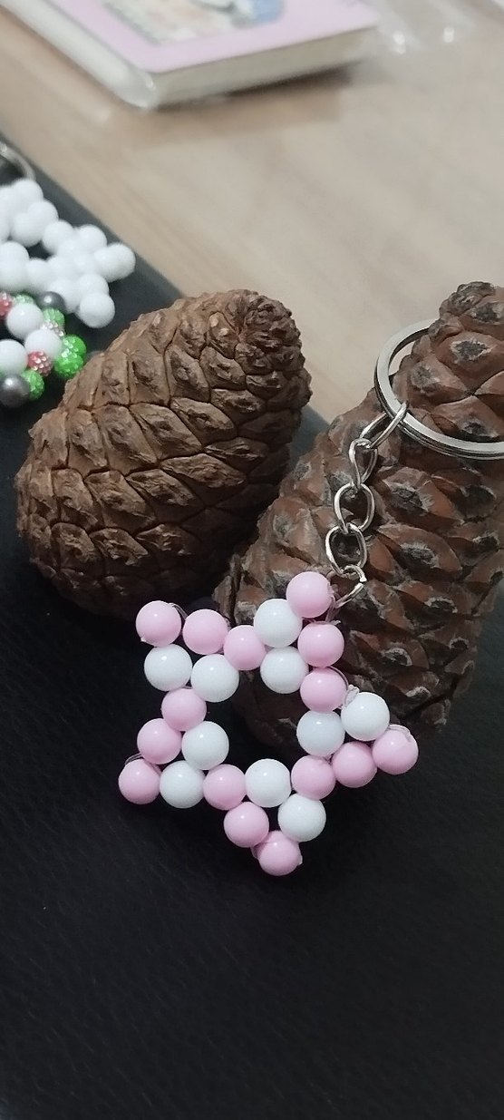 Pastel pembe ve beyaz boncuklardan yapılmış yıldız şeklinde bohem tarzda anahtarlık. Anahtarlarınıza retro ve rahat bir dokunuş katar.