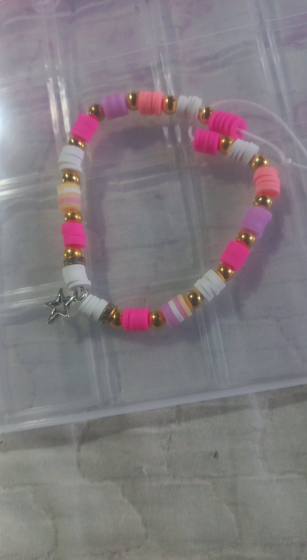 Pembe, beyaz ve altın renkli boncuklardan oluşan, küçük yıldız figürlü bohem ve retro tarzda bileklik. Günlük kullanım için uygundur.