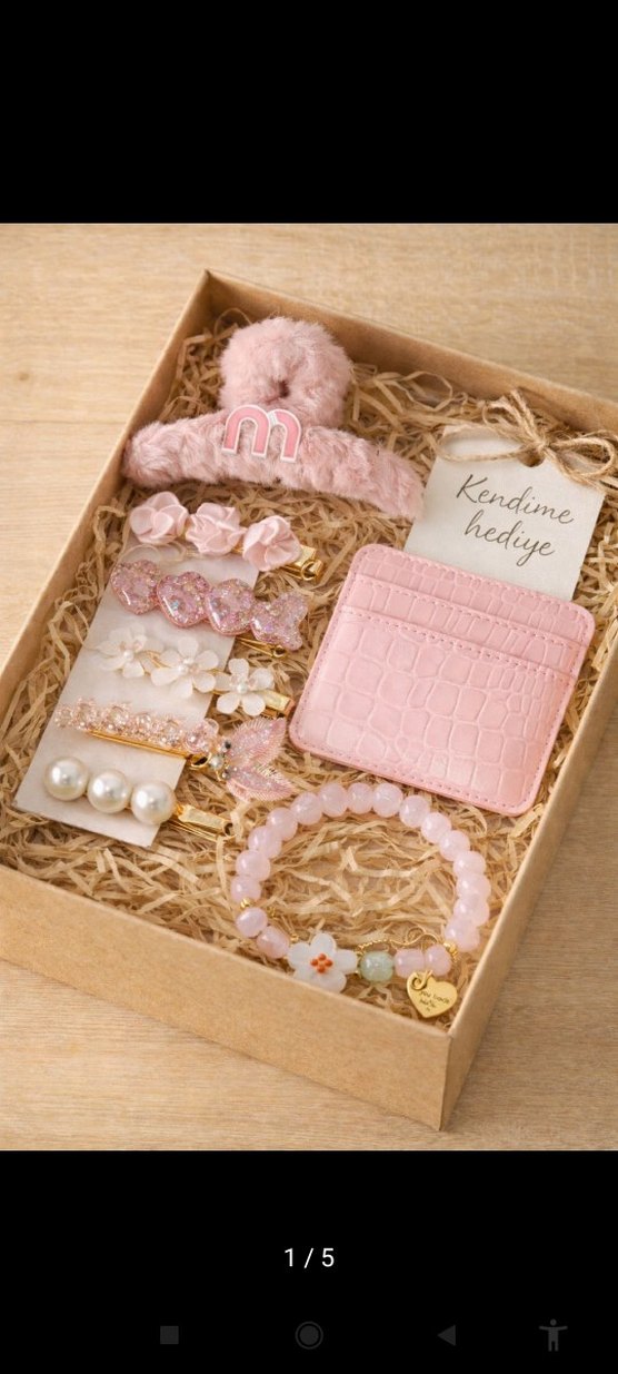 Pastel pembe, boncuklu ve baskılı bohem tarzda çocuk saç aksesuar seti. Yumuşak saç bandı, küçük kartlık ve bileklik içerir.