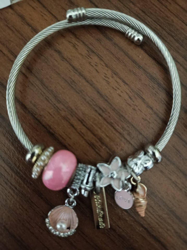 Pembe boncuklar ve çeşitli figürlerin yer aldığı gümüş renkli tel bileklik, bohem tarzıyla günlük kullanıma uygundur.