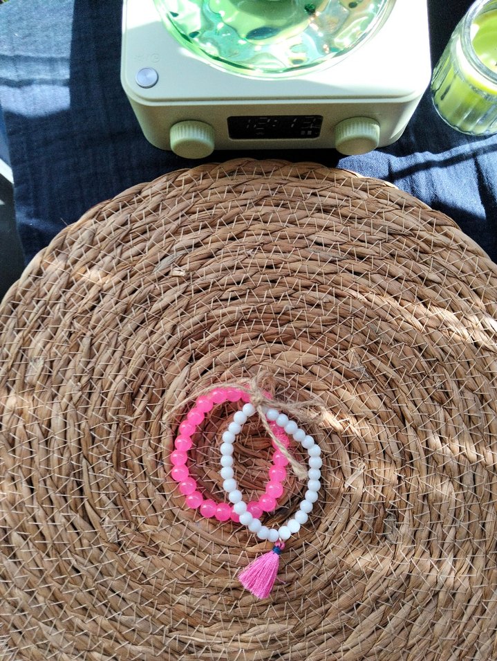 Pembe ve beyaz boncuklardan oluşan, küçük püsküllü bohem tarzda kadın bilekliği, günlük kullanıma uygundur. Kendi el yapımımdır. İnce bileklere uygundur.
