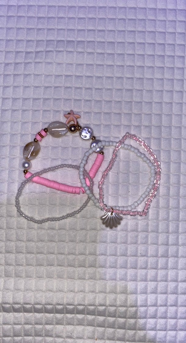 Pastel pembe renkli, boncuklu ve kabuk detaylı bohem tarzı kadın bileklik seti.
