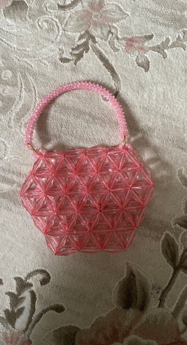 Plastik malzemeden yapılmış, geometrik tasarımlı pembe boncuklu bohem tarzda kadın çanta. Pastel tonlarda, minimal dokunuşlu günlük kullanıma uygun.