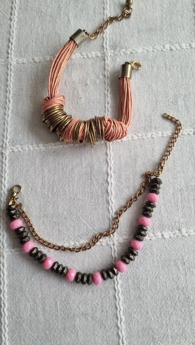 Pembe boncuklar ve nakış detaylarıyla bohem tarzda kadın el zincirleri. Renkli ve günlük kullanıma uygun, retro havasında.