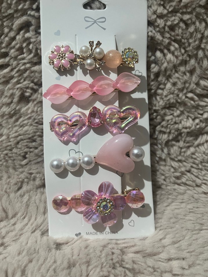 Pembe pastel tonlarda boncuklu ve dekoratif kalp, inci ve çiçek tasarımlı bohem tarzı kadın saç tokaları seti .