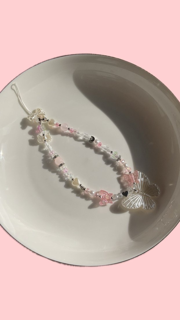 Kelebek temalı pembe parlak boncuklarla süslenmiş telefon charmı. Bileğin geçebileceği boyuttadır. kristal ve akrilik boncuk karışımı ile yapılmaktadır. çelik metal kullanıldığı için zamanla kararma yaparak parlaklığını kaybetmemektedir. Günlük kullanıma uygundur.