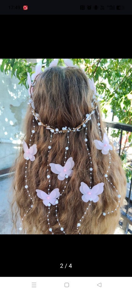 Pembe pastel tonlarda, boncuklu ve örme kumaştan yapılmış bohem kelebek saç aksesuarı.