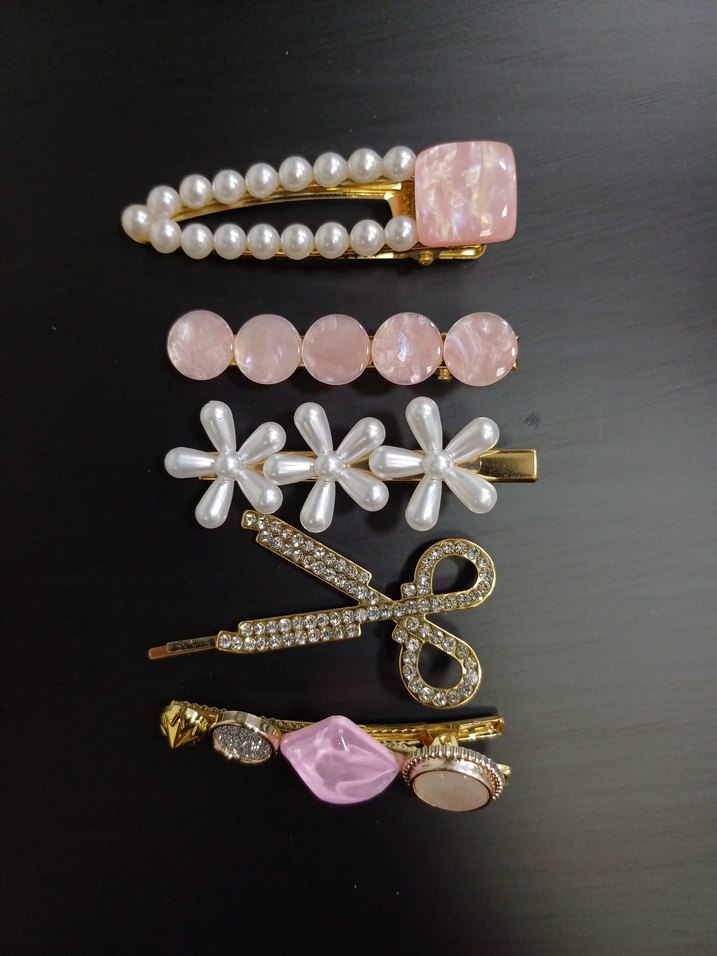 Pembe pastel tonlarda boncuklu plastik saç tokaları seti, inci ve çiçek detaylarıyla bohem ve minimal tarz için uygun.