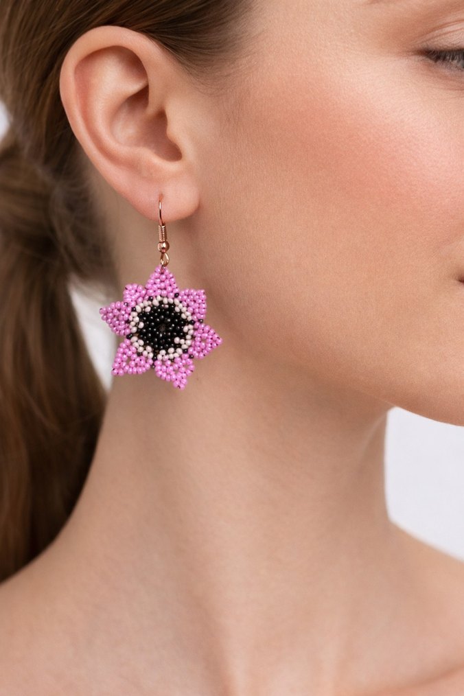 Pembe boncuklarla yapılmış, renkli çiçek desenli kısa uzunlukta, bohem ve retro tarzda günlük kullanıma uygun küpe.