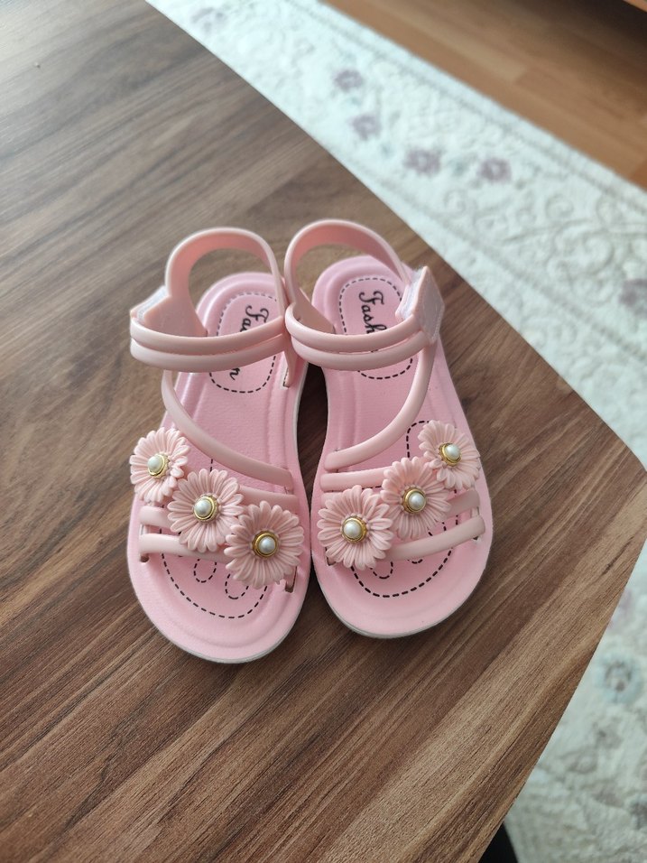 Pastel pembe renkte, boncuklu çiçek desenli bohem tarzı kız sandalet. Yumuşak kauçuk malzemeden üretilmiştir, rahat ve şık bir görünüme sahiptir. sıfır ürün