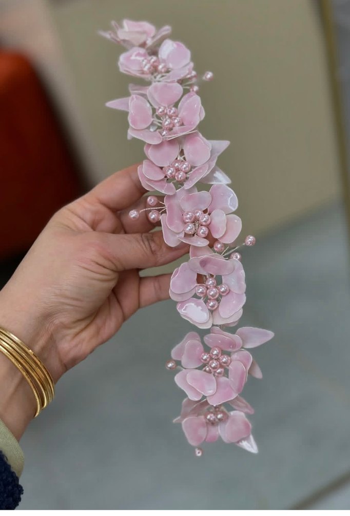Pembe plastikten yapılmış, boncuk detaylı çiçeklerle süslenmiş, bohem ve gösterişli tarz için uygun saç aksesuarı.
