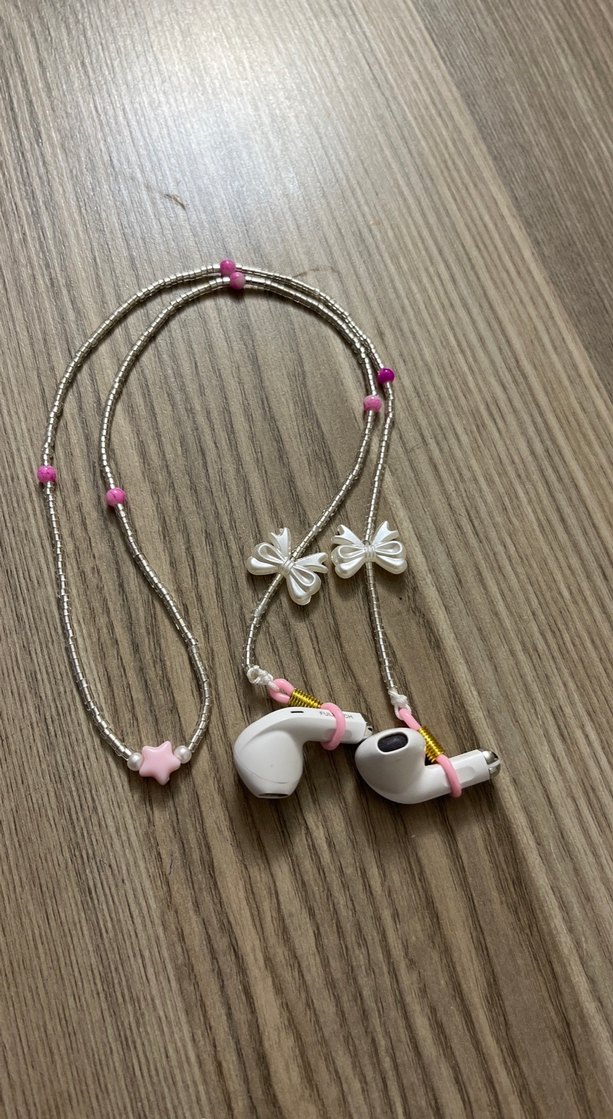 Pembe boncuklu çocuk takısı, işlemeli kelebek detayları ve pastel boncuklarla bohem tarzı yansıtır. Kulaklıklar için dekoratif ve işlevsel bir aksesuar .
