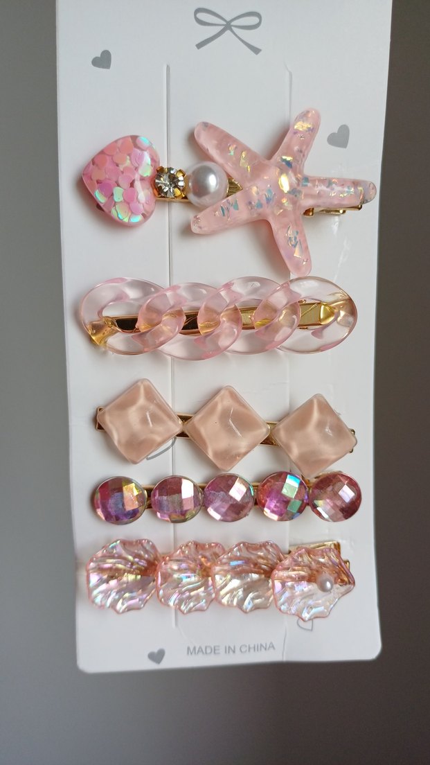 Pastel pembe renklerde, kalp, denizyıldızı ve zincir şeklinde boncuklu saç tokaları seti.