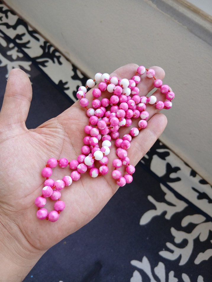 Pembe ve beyaz boncuklardan oluşan, bağlama desenli kadın el zinciri. Bohem ve retro tarzını yansıtır, partiler için uygun.