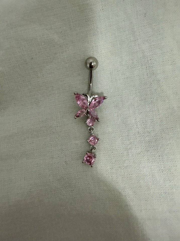 Pembe boncuklarla süslenmiş kelebek ve sarkıt detaylı, minimal ve zarif kadın göbek piercingi.