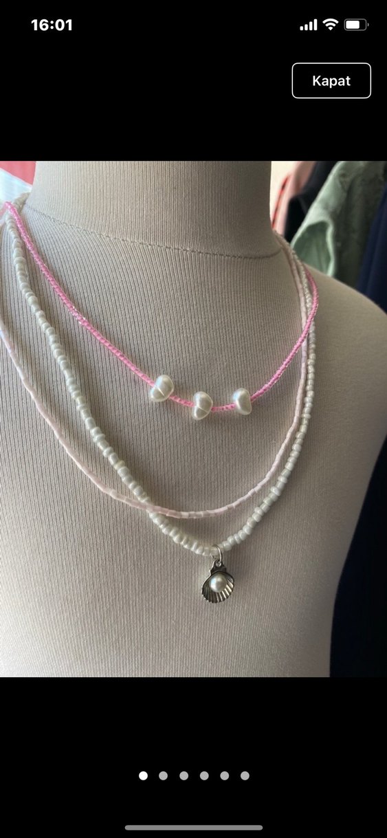 pastel pembe boncuklu kolye, işleme detayları ve küçük deniz kabuğu kolye ucu kolye el emeği