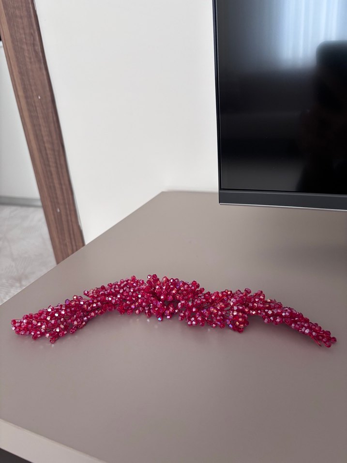 İpek gibi kırmızı boncuklarla süslenmiş çağdaş ve göz alıcı kadın saç aksesuarı.