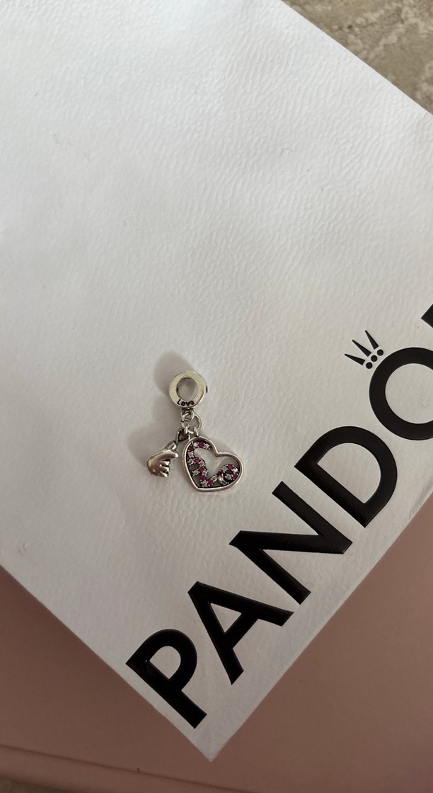 Bu parlak pembe charm, boncuklu kalp ve küçük el detayıyla romantik ve trend sokak stiline uygun.