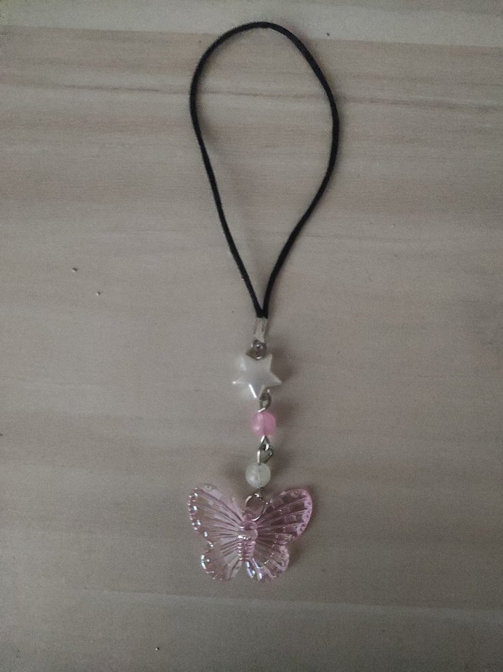 Pastel pembe kelebek ve yıldız figürlü, boncuklu detaylara sahip, siyah ipli kadın charmı. Bohem ve minimal tarzda günlük kullanım için uygun.