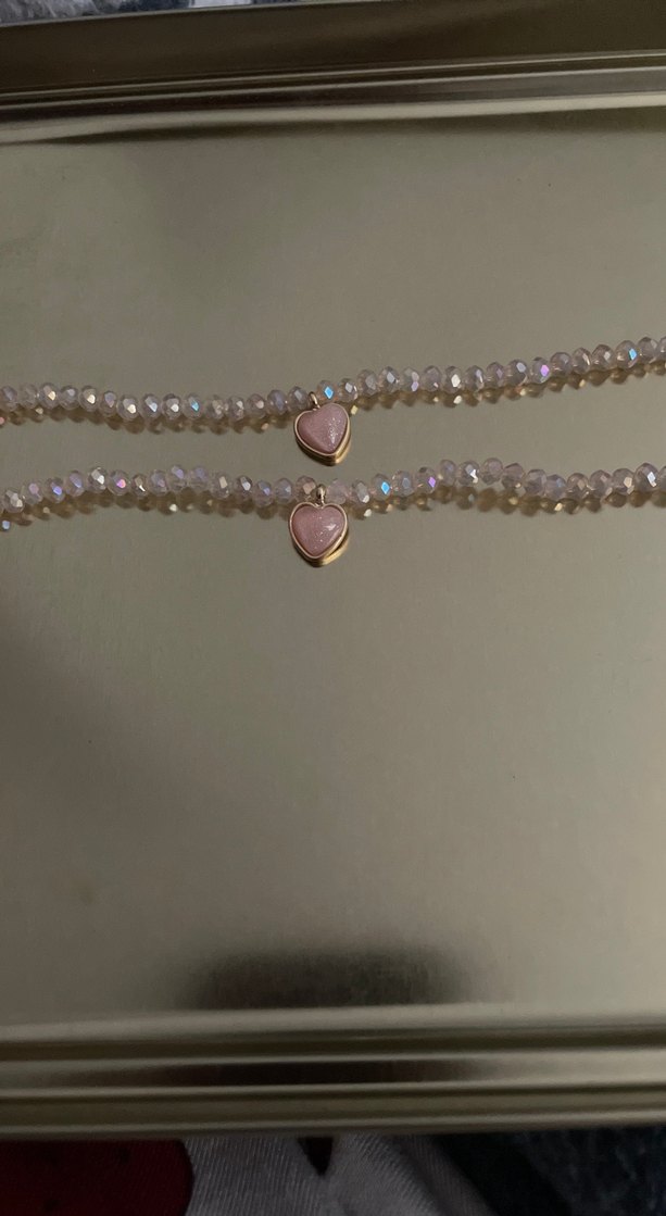 Pastel pembe boncuklardan oluşan midi uzunlukta, nakışlı kalp figürlü bohem tarzda romantik bileklik.