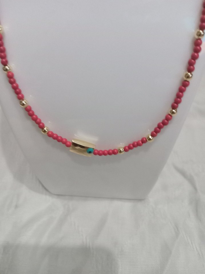 Pembe boncuklar ve küçük altın detaylarla kısa, minimalist altın kolye ucu bulunan bohem tarzda mini kolye. doğaltas kolye