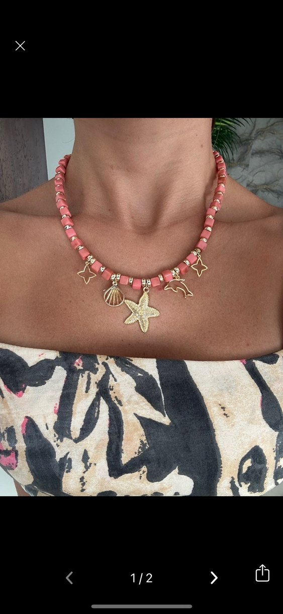 Pembe renginde boncuklu, kısa boyda mini kolye. Deniz temalı altın rengi figürler içerir. Bohem tarz için uygundur.