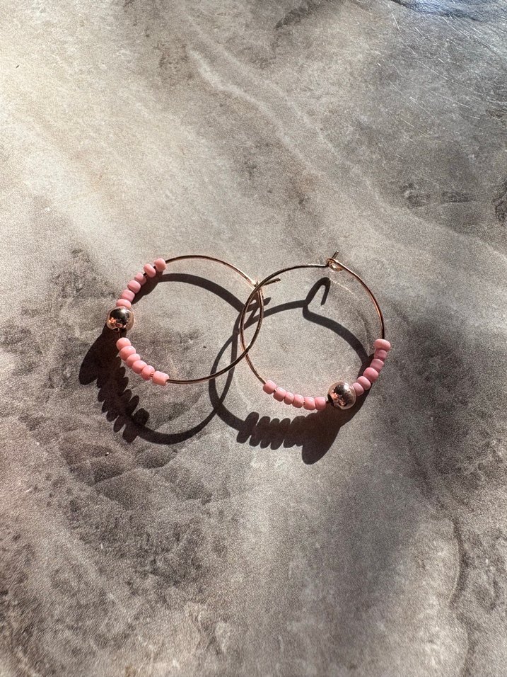 Pembe boncuklarla süslenmiş mini halka küpeler, minimal ve bohem tarzda, romantik akşamlar için uygun. Kısa uzunlukta ve sade tasarımlı.
