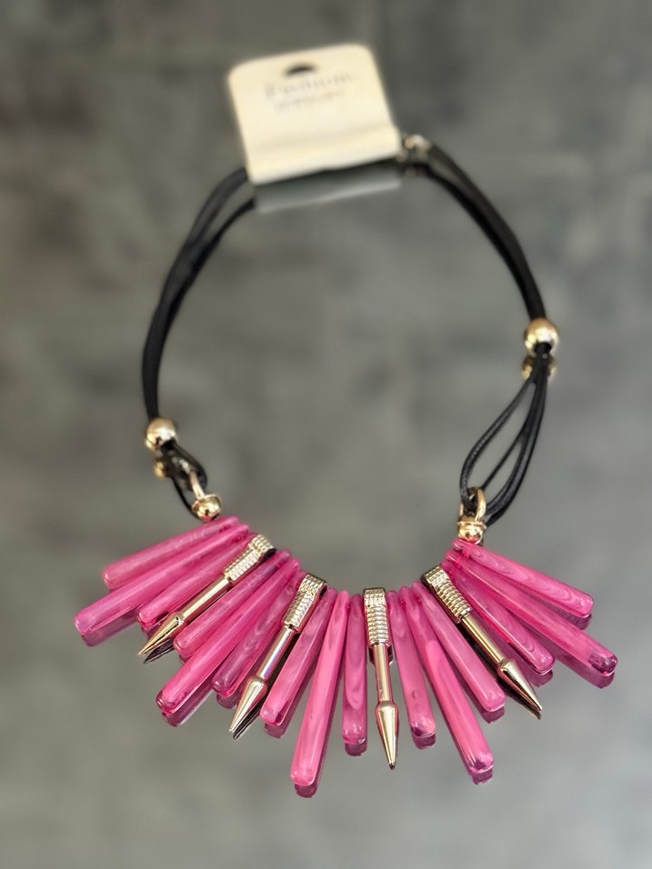 Kısa boyda, pembe boncuklu ve tie-dye desenli kadın kolyesi, altın renkli sivri detaylarla cesur ve gösterişli bir tarz sunar. Günlük kullanım için uygundur.