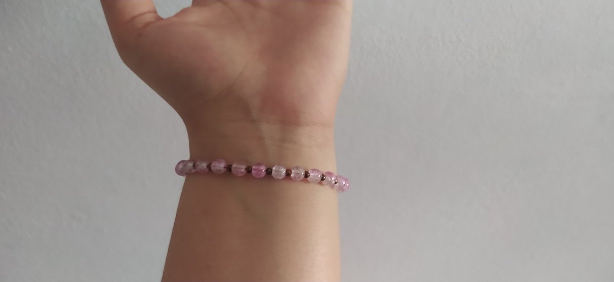 Pembe pastel boncuklardan oluşan minimalist tarzda kadın bilekliği. Günlük kullanım için bohem tarzıyla uyumlu.