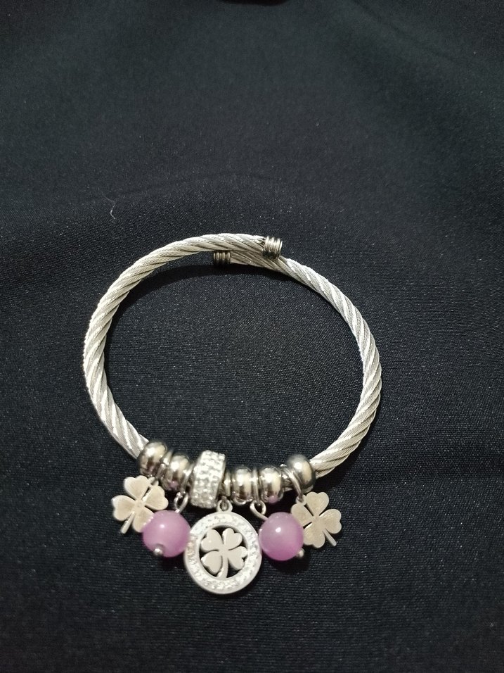 Gri burgu detaylı, pembe boncuklu ve çiçek desenli minimalist kadın bilekliği, günlük kullanıma uygun bohem tarzda.