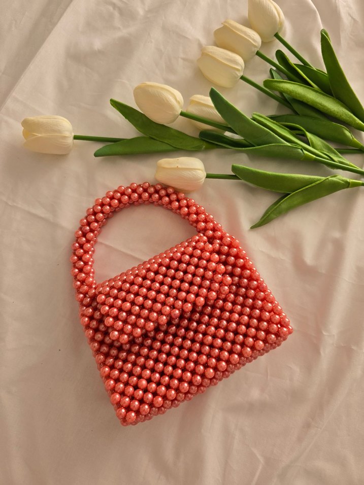 Pastel pembe renkte, boncuk detaylı örgü kadın çantası. Bohem ve minimal tarzda, günlük kullanım için uygun, mini el çantası