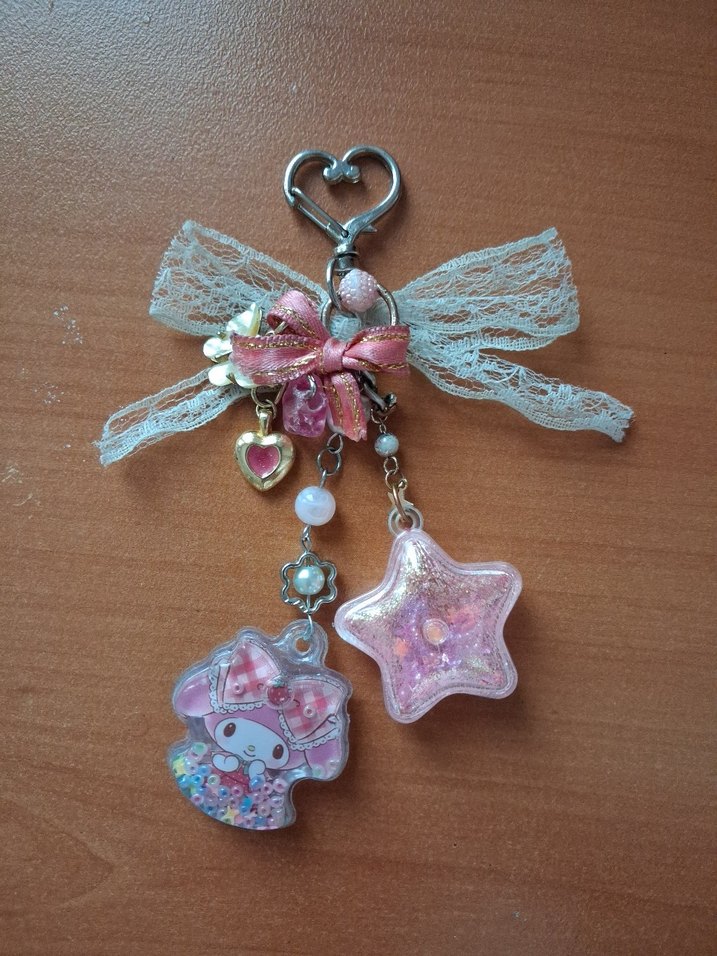 Pastel pembe renkte, boncuklu, dantel fiyonk ve yıldız ile karakter figürü süslemeli bohem anahtarlık. iade kabulu yoktur. ciddi alıcılar iletişime geçsin