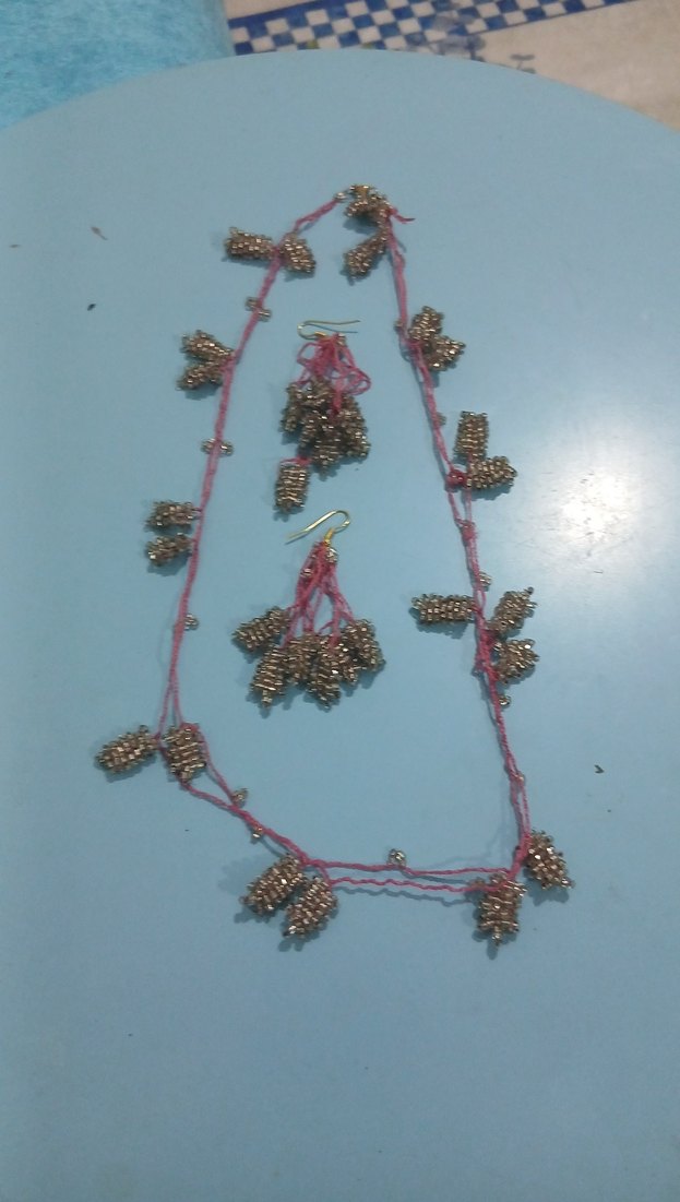 Pembe renkli, boncuk işlemeli uzun bohem tarzda kolye ve uyumlu küpe seti, parti için uygun.