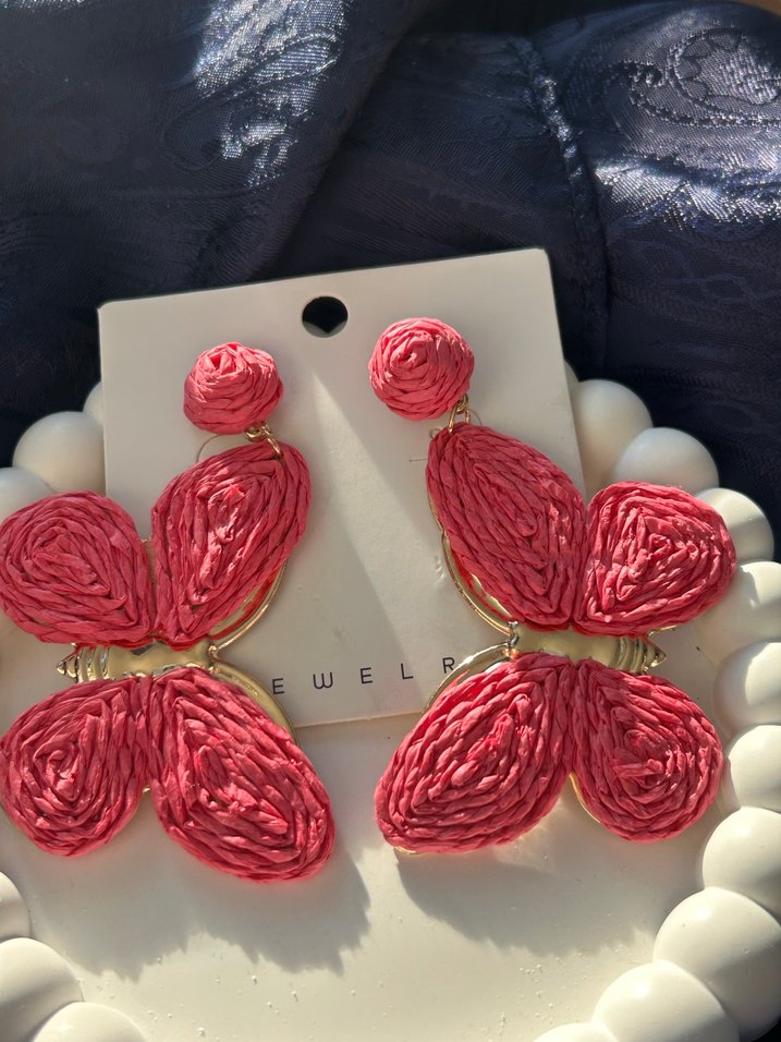 Pembe boncuklu, nakış işlemeli uzun küpeler. Renkli bohem tarzıyla düğün için uygundur.