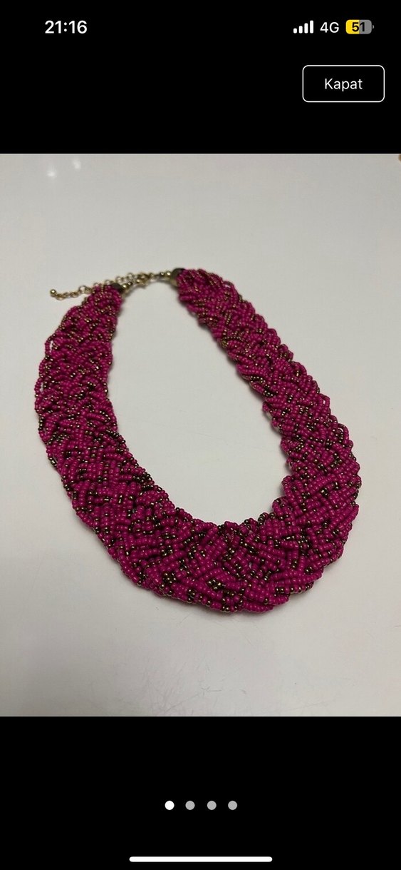 Pembe boncuklarla örülmüş, yılan deseni taşıyan uzun ve renkli bohem tarzda günlük kullanıma uygun kolye.