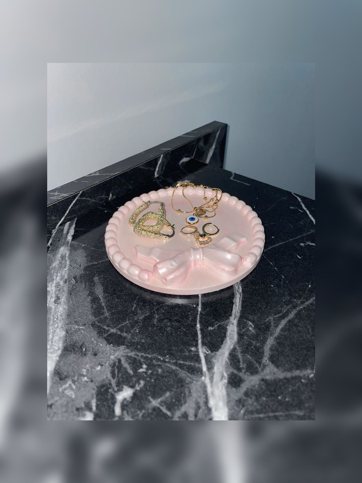 Pembe pastel renkte, boncuk işlemeli modern takı tabağı dilerseniz fincan altlığı olarak ta kullanabilirsiniz.