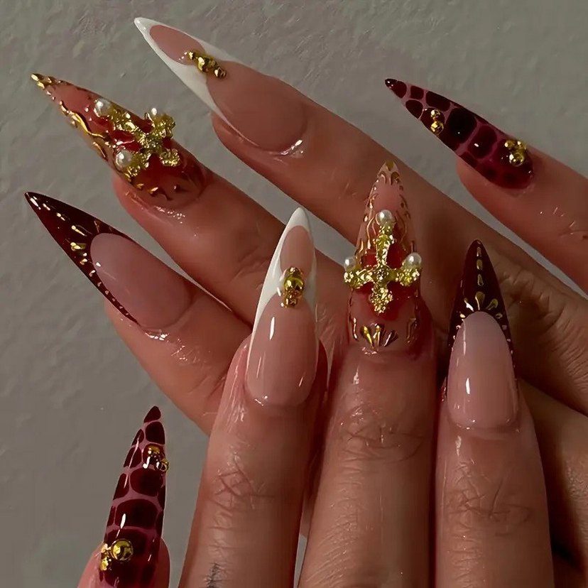 Uzun, sivri tırnaklarda altın ve inci detaylı parlak bordo tırnak süslemeleri. Fotoğrafta göründüğü gibidir